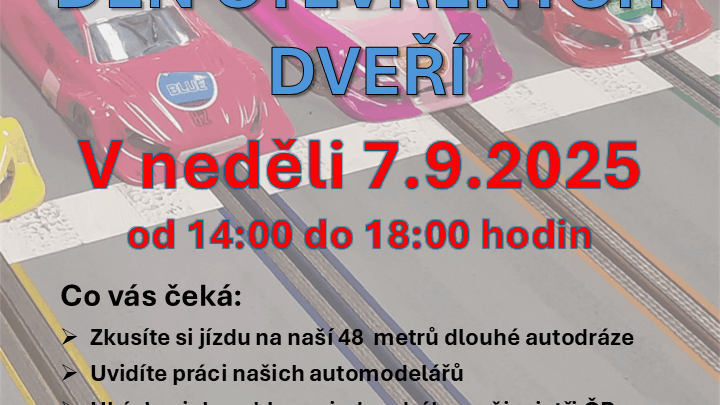 Jak jste se možná dozvěděli na Sportmanii, 7.9. jsme pro vás připravili v naší klubovně Den otevřených dveří, jehož součástí bude i kvalifikace a závod pro veřejnost. Přijďte si změřit síly s ostatními závodníky! Již to nebude jenom o tom držet ovladač, ale auto bude potřeba ovládat, aby jste v...